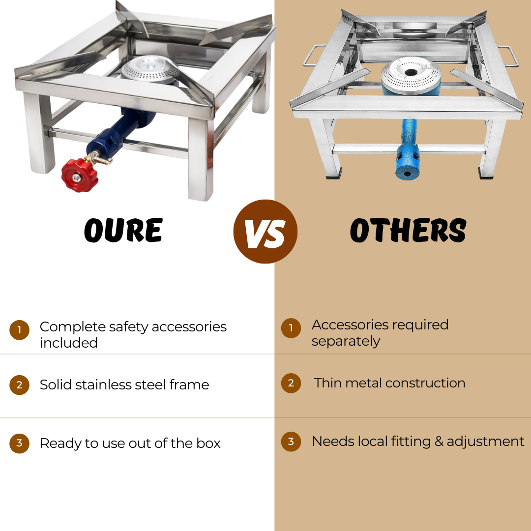 Engineered for durability and performance, this stainless steel bhatti features solid SS construction for stability during use. The complete accessory kit provides everything needed for immediate operation: a 1.5-meter gas pipe, high-pressure adaptor for reliable fuel delivery, two butterfly clips for secure connections, and a gas stove lighter for convenient ignition. Ideal for both residential and commercial cooking applications, this bhatti combines robust materials with practical accessories to deliver consistent results.
